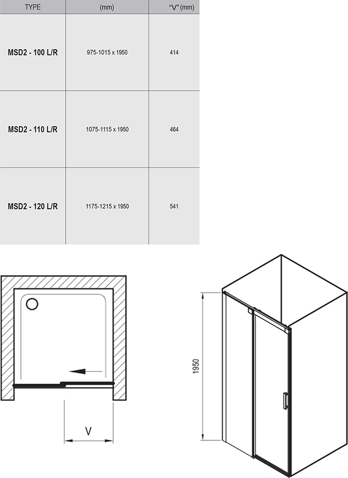 Výrobek se skládá ze dvou dílů, z nichž jeden díl tvoří posuvné dveře. Montuje se do obložené koupelny (do vyzděné niky) přímo na podlahu se zabudovaným odtokovým žlabem či podlahovou vpustí.
