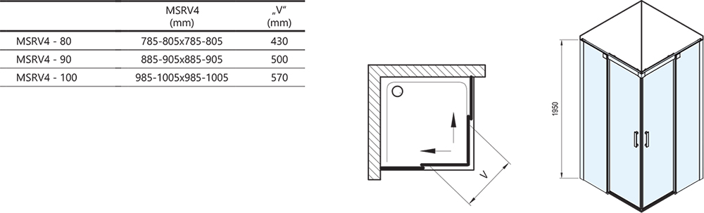 Výrobok sa skladá z dvoch rovných pevných dielov a dvoch rovných pohyblivých dielov, ktoré tvoria posuvné dvere. Montuje sa do obloženého rohu kúpeľne priamo na podlahu so zabudovaným odtokovým žľabom či podlahovou vpustou.