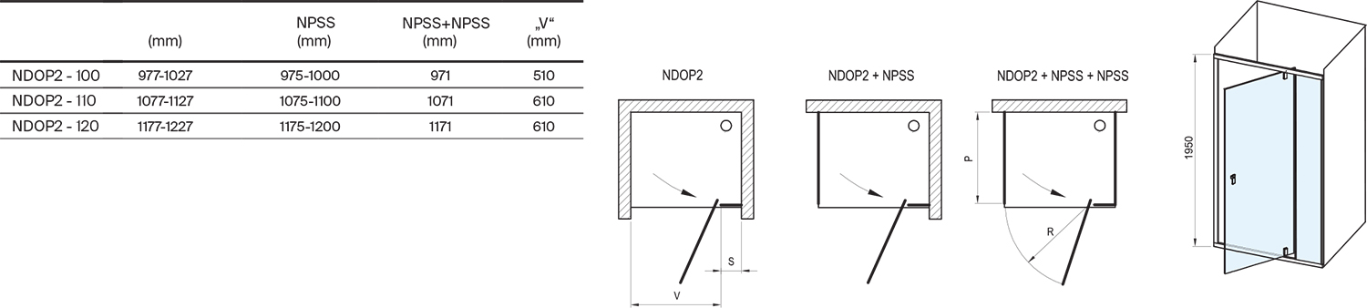 Výrobok sa skladá z jedného rovného pevného dielu a jedného rovného otočného dielu, ktorý tvorí dvere. Otočením výrobku o 180° získate ľavý alebo pravý variant otvárania dverí. Montuje sa do obloženého rohu kúpeľne (ideálne do vymurovanej niky alebo v kombinácii s pevnou stenou NPSS) na vaničky Ravak Aneta, Angela, Perseus, Perseus Pro, Perseus Pro Flat, Perseus Pro Chrome, Perseus Pro 10 °, Gigant Pro, Gigant Pro Flat, Gigant Pro Chrome, Gigant Pro žľabom či podlahovým vpustom. Kombináciou s dvoma pevnými stenami typu NPSS vytvoríte sprchový kout v tvare „U“. Použitím rozširovacieho profilu NNPS možno výrobky rozšíriť o 20 mm, preto sa dokonale prispôsobia stavebným nerovnostiam až o 4 cm na každej strane.