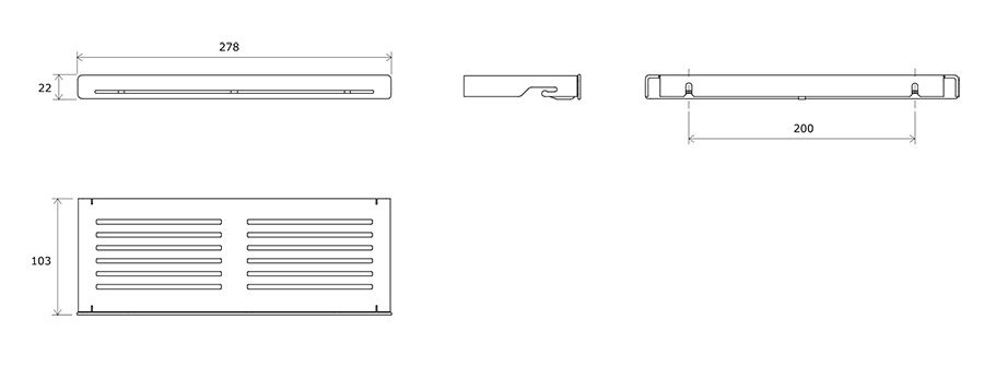 Rovná plocha poličky je perforovaná tak, aby sa voda nedržala na povrchu, napriek tomu však poskytuje stabilitu umiestneným predmetom. Po stranách poličky sa nachádzajú praktické háčiky na zavesenie žinky. Uprostred poličky je uchytený spodný háčik, ktorý udrží aj ťažší predmet ako je napríklad fén. Kombináciou dvoch a viacerých kusov poličiek docielite efektnú zostavu s extra odkladacou plochou. Odporúčame kombinovať s rohovou poličkou Slim C. Na vonkajšie čistenie odporúčame používať prípravok Ravak Cleaner Chrome. Montáž na dve hmoždinky. Rozteč skrutiek je 200 mm.