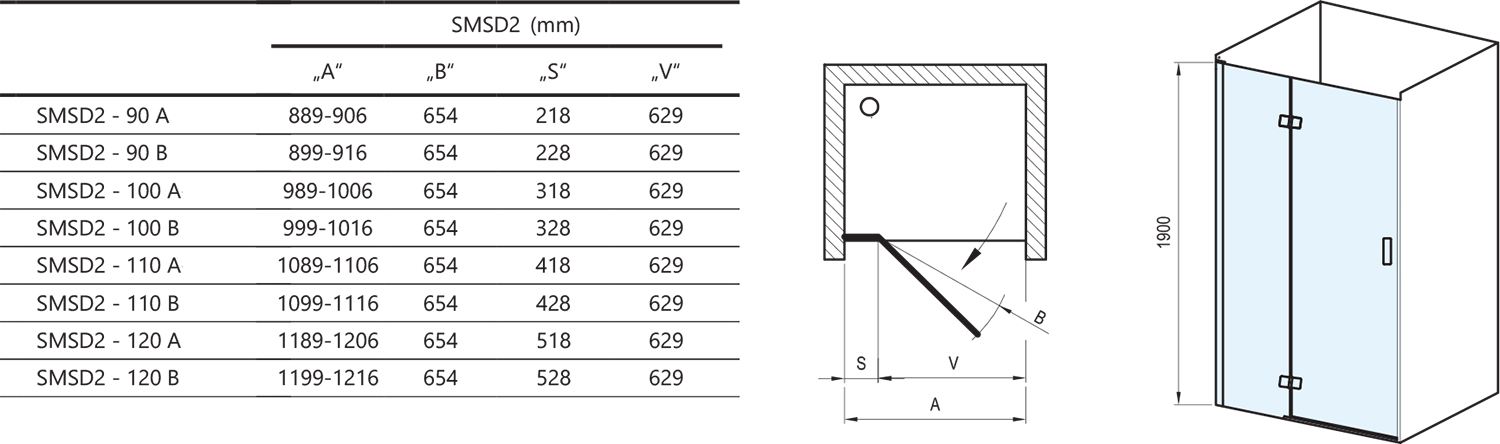 Sprchové dvere sa montujú do obloženého rohu kúpeľne (ideálne do vymurovanej niky alebo v kombinácii s pevnou stenou SMPS) na vaničky Ravak Gigant Pro, Gigant Pro Chrome alebo priamo na podlahu so zabudovaným odtokovým žľabom či podlahovým vpustom. Varianta B je určená pre stavebný otvor až o 16 mm väčší, než je štandardný rozmer výrobku. Pre kombináciu s pevnou stenou volte dvere typu B.